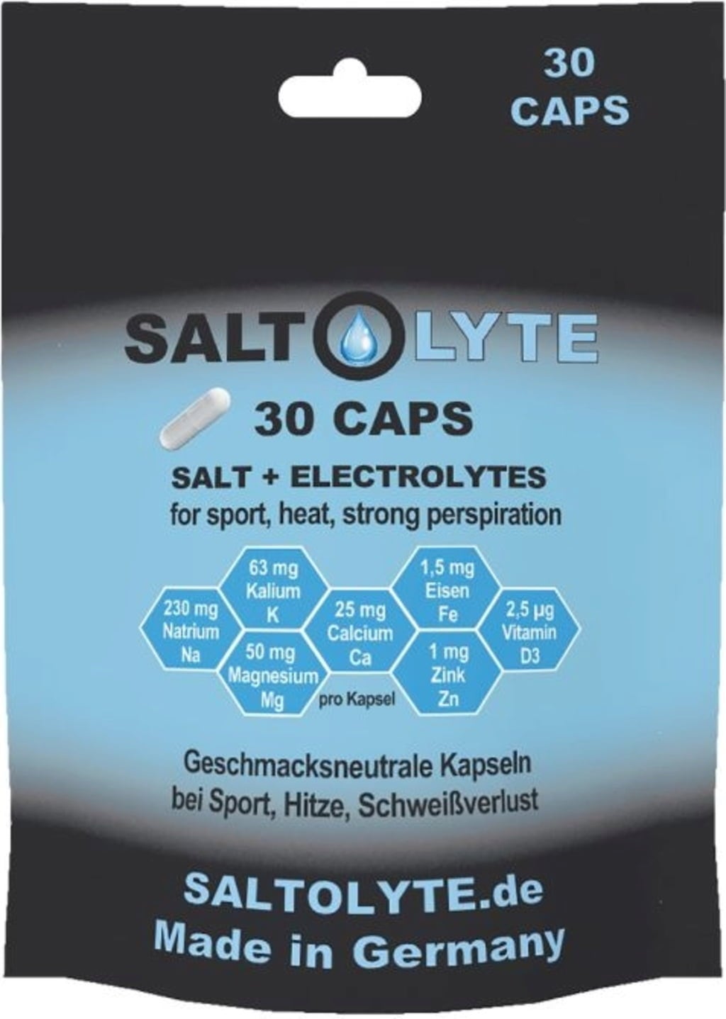 Estas cápsulas sin sabor contienen una combinación de sodio, potasio, calcio, magnesio, hierro, zinc y vitamina D3. Desarrolladas para deportistas con sudoración elevada durante actividades como triatlón, running, ciclismo, fútbol o fitness. La cubierta vegetal de la cápsula garantiza una ingesta agradable, sin regusto salado.