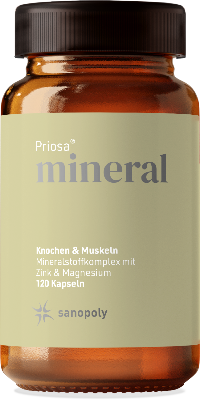 Priosa®MINERAL es un complejo de 12 minerales y oligoelementos diferentes. Además, las cápsulas contienen además el azufre natural metilsulfonilmetano (MSM) y los aminoácidos L-cisteína y L-metionina.