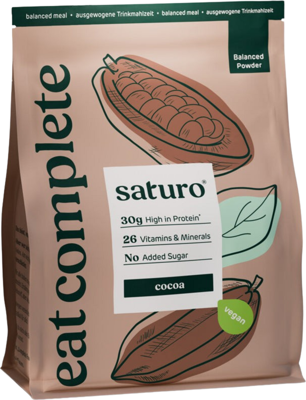 ¿A menudo no tienes tiempo para cocinar entre el trabajo, los estudios y el estrés del tiempo libre? Lo sabemos. La solución: ¡el polvo vegano Balanced de SATURO®! Se trata de una comida líquida completa, rica en proteínas y fibra, que se mezcla con agua potable.