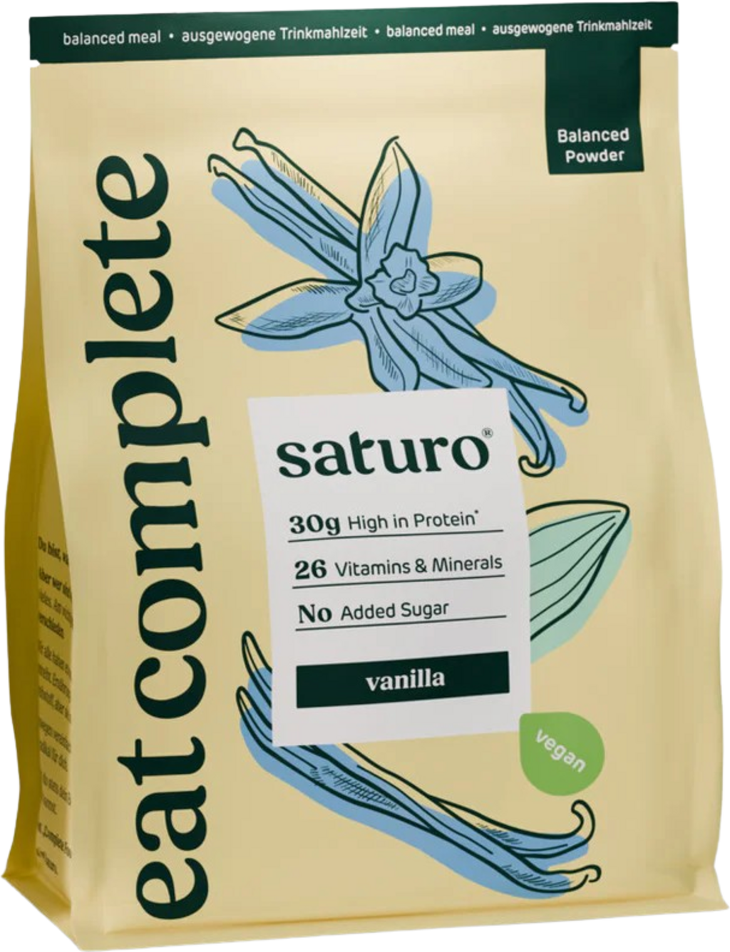 ¿A menudo no tienes tiempo para cocinar entre el trabajo, los estudios y el estrés del tiempo libre? Lo sabemos. La solución: ¡el polvo vegano Balanced de SATURO®! Se trata de una comida líquida completa, rica en proteínas y fibra, que se mezcla con agua potable.