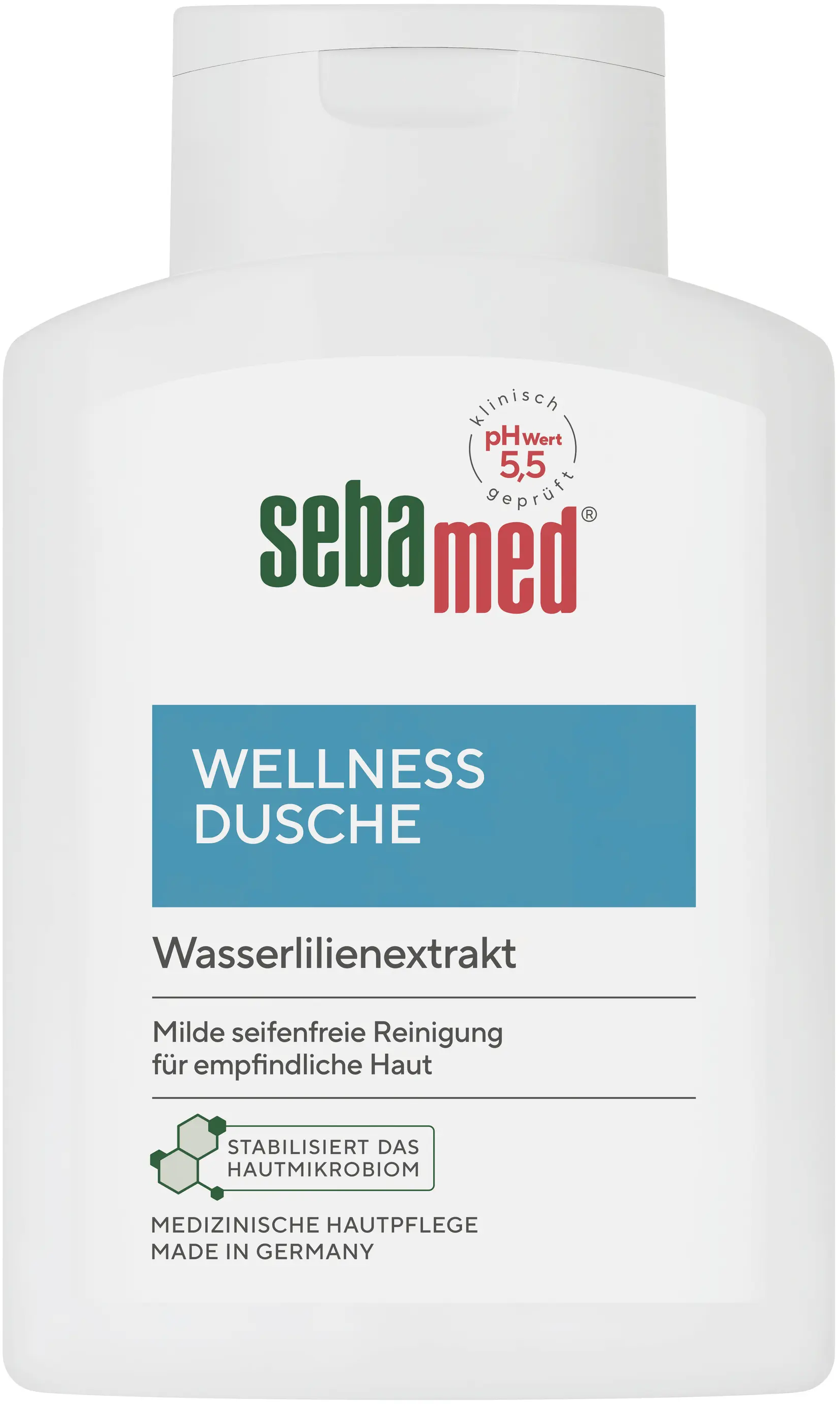 La ducha de bienestar con extracto de nenúfar de Sebamed es fácilmente adecuada para el uso diario en pieles sensibles. Limpia la piel con mucha delicadeza y suavidad. La fórmula suave de la ducha de bienestar tiene un valor de pH de 5,5 y, por lo tanto, puede apoyar de manera óptima la propia barrera protectora de la piel.