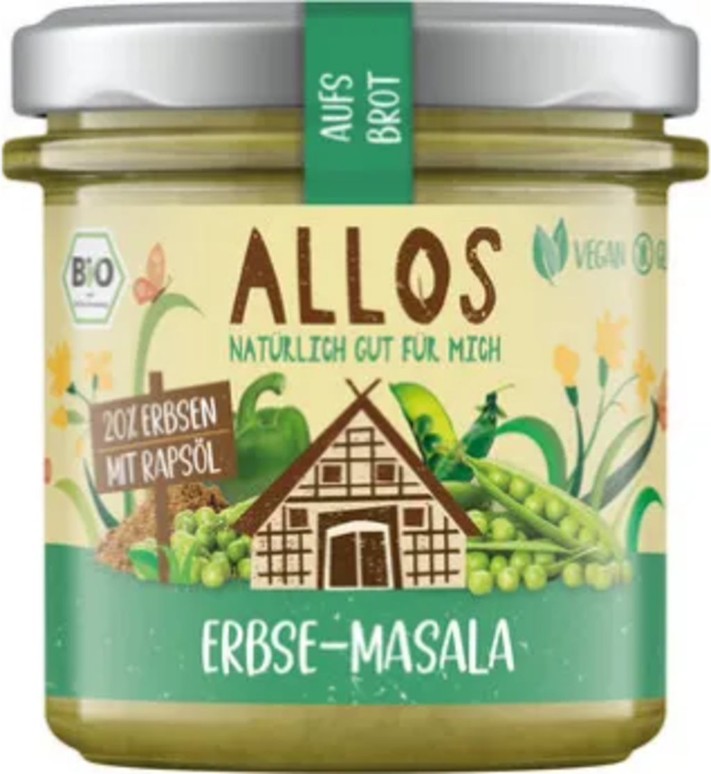 La crema para untar de guisantes y masala ecológica, vegana y sin gluten de ALLOS está elaborada con aceite de colza y aromatizada armoniosamente. Las especias incluyen canela, cardamomo, sal marina, nuez moscada y cilantro. Su consistencia cremosa lo hace perfecto para untar sobre pan, convirtiéndolo en una absoluta delicia culinaria para los amantes de los sabores exóticos.