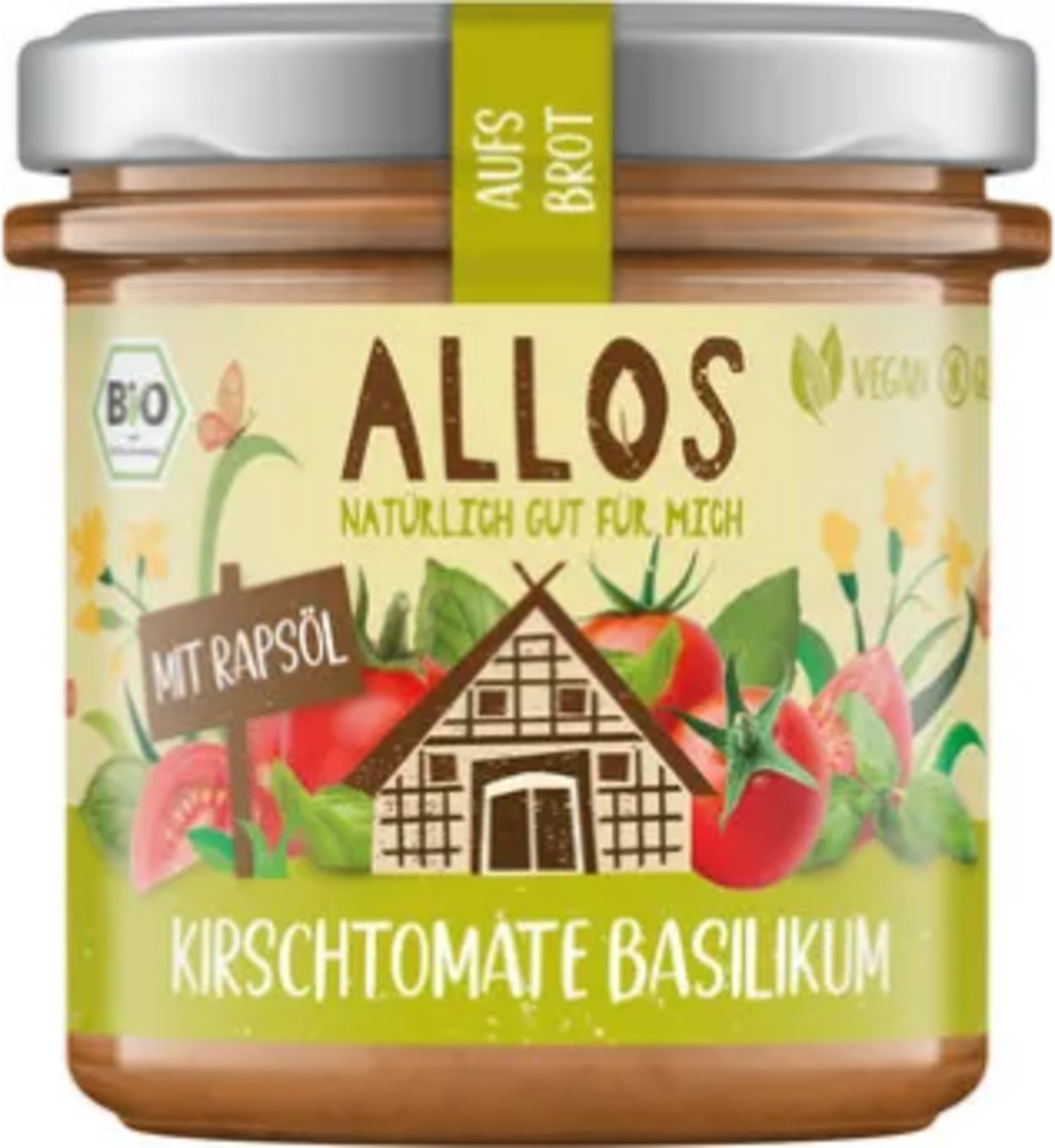La crema para untar con tomates cherry y albahaca de ALLOS tiene un sabor afrutado y especiado y es ideal para untar en pan gracias a su consistencia cremosa y untable. La receta vegana se refina con sal marina, pimentón y chile en polvo, entre otras cosas.