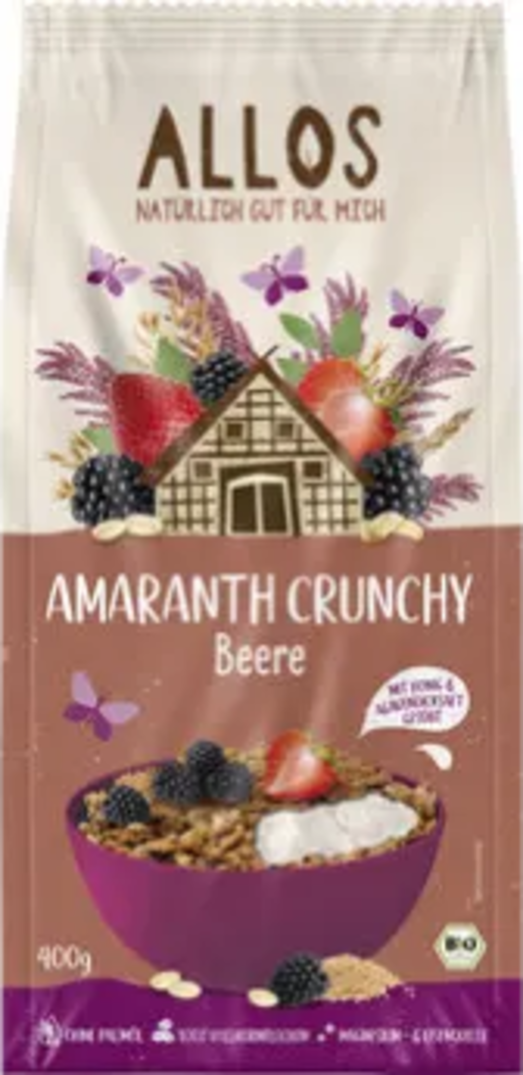 copos de avena integral[1], 10 % Copos de maíz de amaranto[1], maíz[1], 28 % Amaranto integral[1], 5 % miel[1], Glukosesirup[1], sal marina, 8 % miel de ágave[1], jarabe de arroz[1], Amaranto integral (reventado y molido) (6%)[1], crispies de arroz[1], arroz[1], almidón de patata[1], Aceite de girasol[1], linaza[1], Harina de espelta integral (un tipo de trigo)[1], 2 % zarzamoras[1], 1 % Trozos de fresa[1], sésamo[1], agente antioxidante (extractos ricos en tocoferoles)