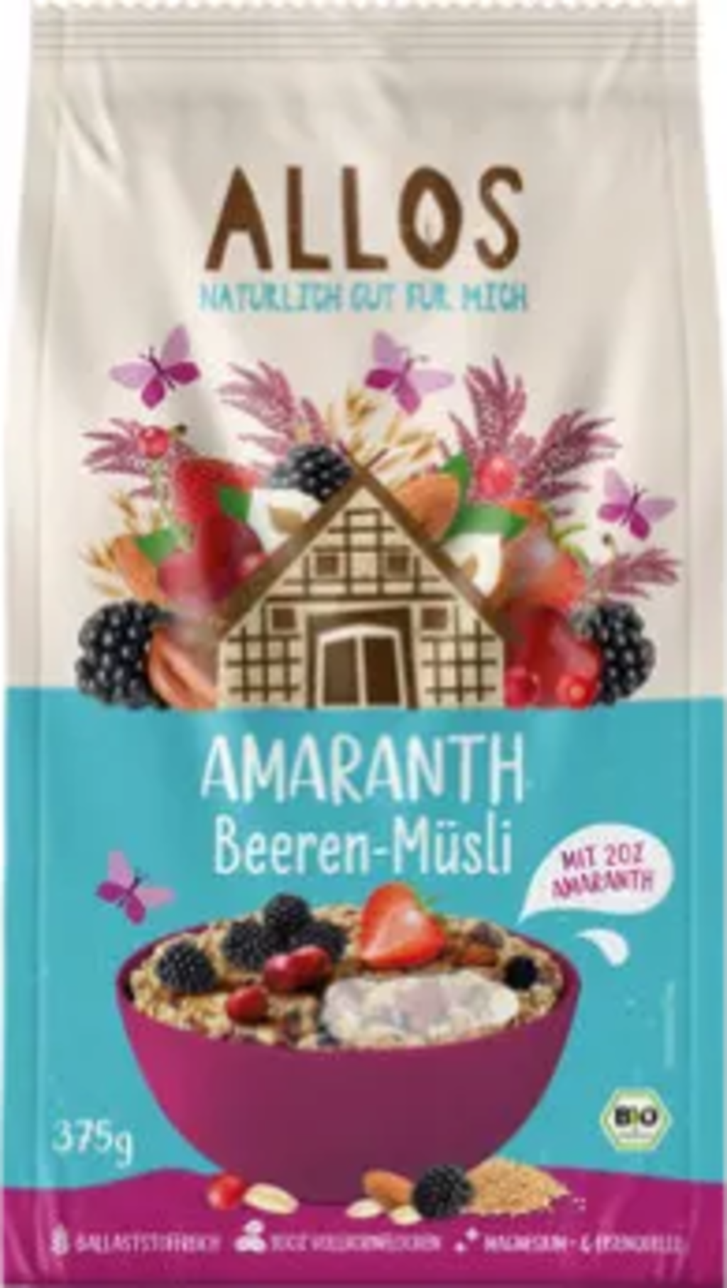 copos de avena integral[1], 20 % Amaranto integral[1], 10 % miel[1], Trozos de fresa[1], guindas[1], zarzamoras[1], Arándano rojo[1], avellanas[1], sésamo[1], almendras ralladas[1], Aceite de palma[1], trigo sarraceno[1], extracto de zumo de manzana[1], cacao en polvo muy desaceitado[1], sal marina, Aceite de girasol[1]