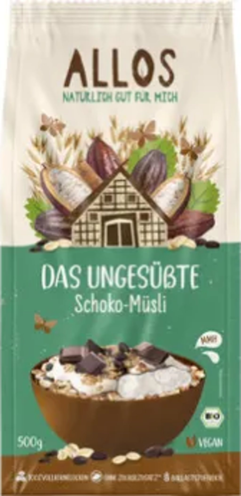 Una mezcla a base de copos integrales enriquecidos con cacao en polvo y trocitos de cacao crujientes, sin azúcares añadidos. El muesli de chocolate ALLOS está elaborado 100% con cereales integrales y, por tanto, contiene mucha fibra. ¡Por eso es la opción ideal para empezar bien el día!