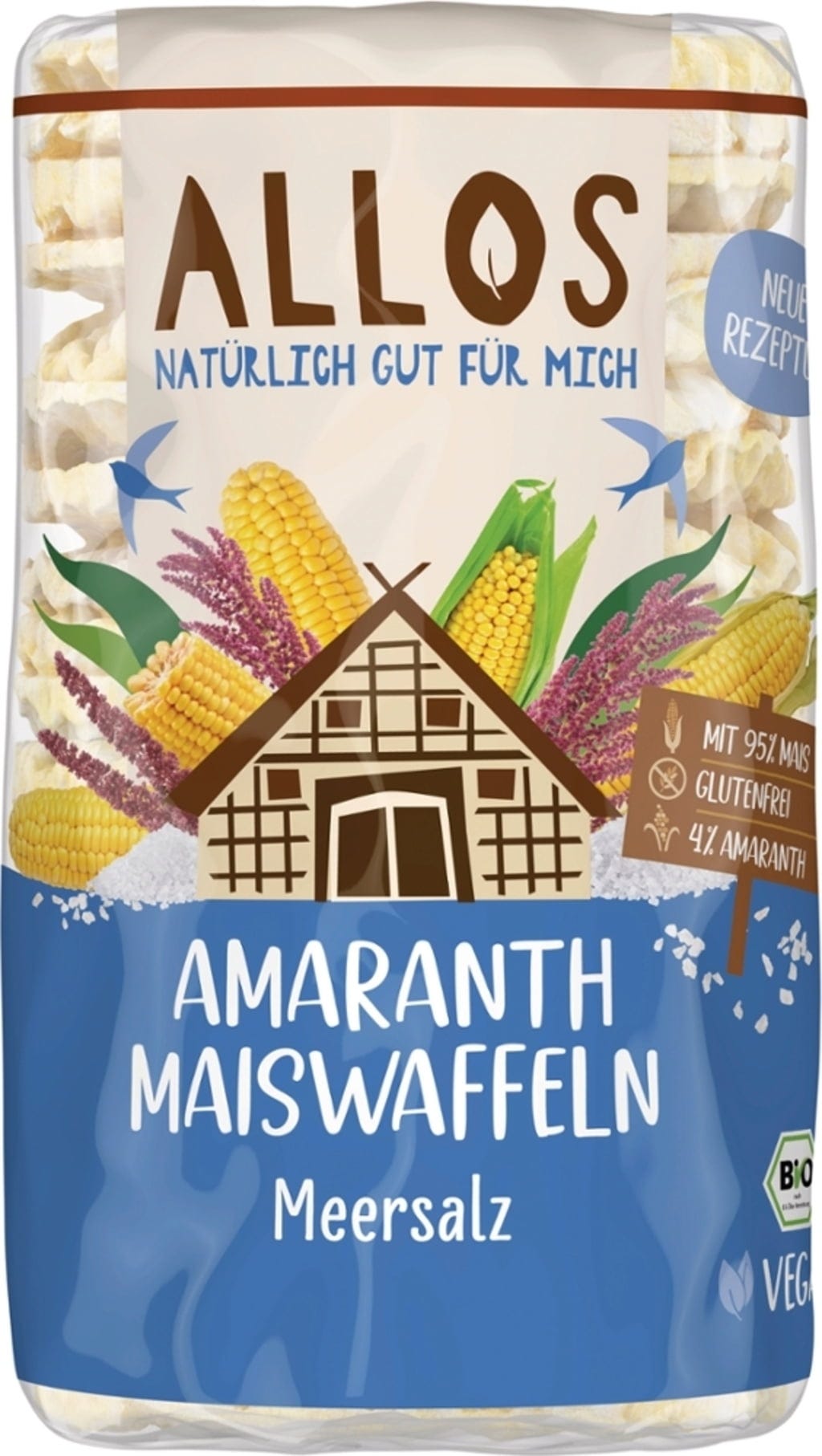 Las tortitas ecológicas de maíz y amaranto con sal marina ALLOS son deliciosamente crujientes y tienen un rico sabor. Ideales como snack vegano entre comidas, se pueden picar solas o condimentar a tu elección.