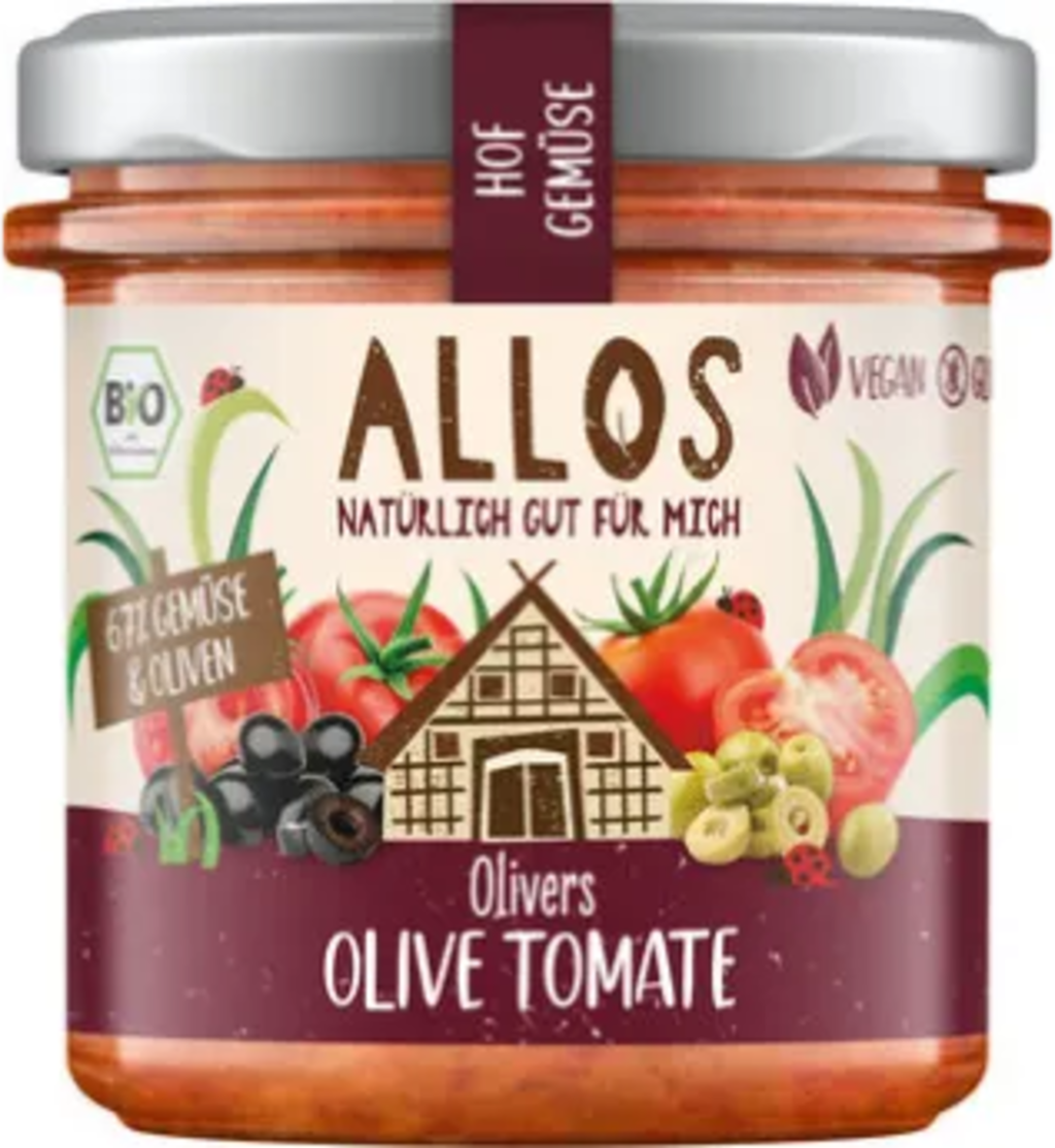 La crema para untar con aceitunas y tomates de la línea Verduras del Huerto Ecológico de ALLOS contiene un 67% de verduras y aceitunas. Una especialidad con sabor mediterráneo que podrás disfrutar por ejemplo sobre pan tostado y que te conquistará por su maravilloso equilibrio.