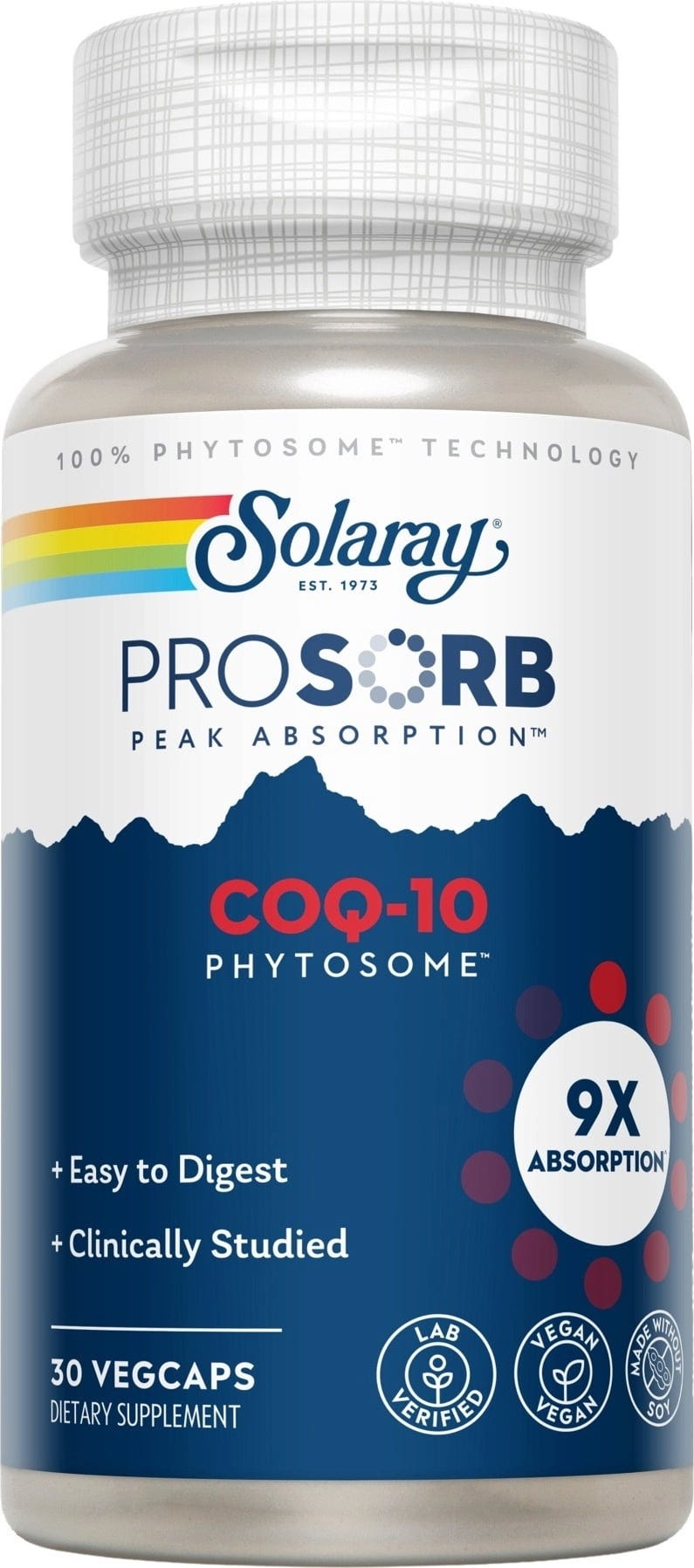 CoQ-10 Pytosome™ ProSorb de Solaray son cápsulas veganas y sin gluten con coenzima Q10. Cada cápsula contiene 200 mg de Ubiqsome® con un contenido garantizado del 20% (40 mg) de coenzima Q10.