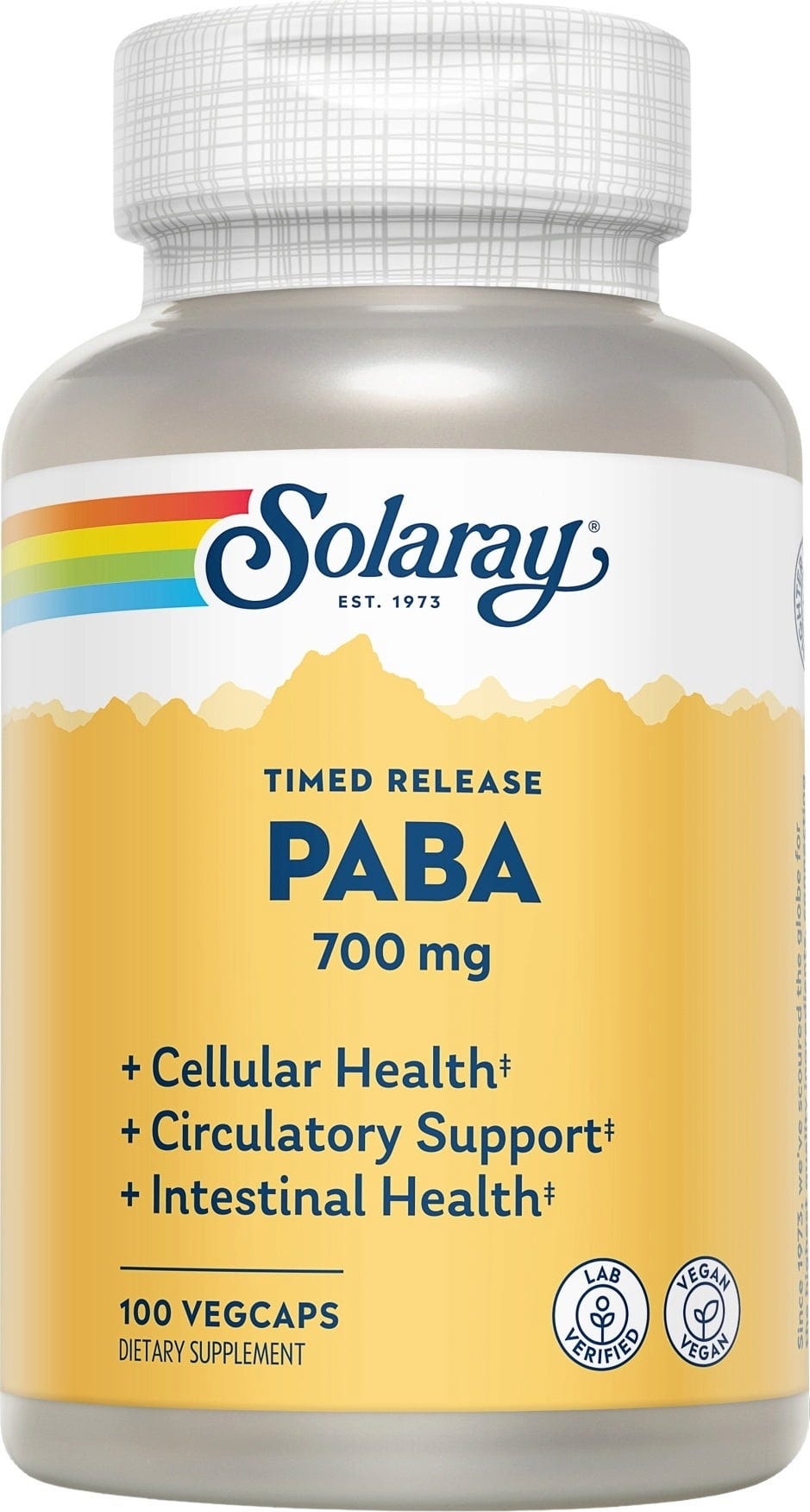 - Este producto se fabrica utilizando una tecnología patentada, de modo que el ingrediente activo se libera en el cuerpo en 2 fases con una liberación prolongada. En la primera fase, parte del ácido 4-aminobenzoico (PABA) se absorbe muy rápidamente. En la segunda fase, el cuerpo absorbe lentamente el resto del nutriente durante un período de 12 horas. De esta manera, PABA es útil para el cuerpo durante un período más largo.