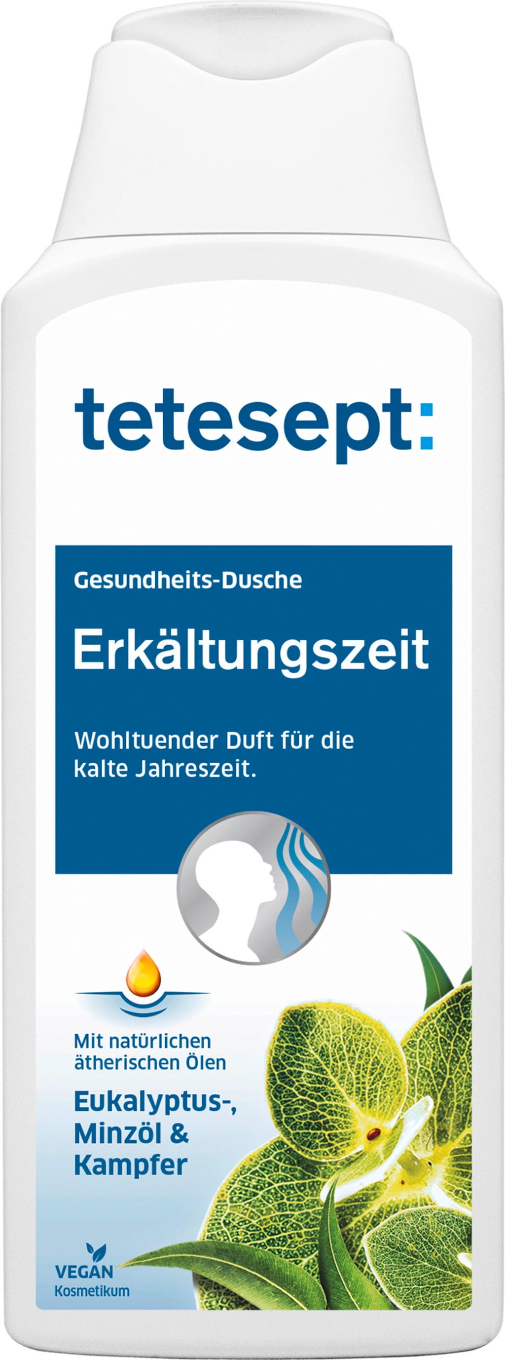El Gel de Ducha - Época de Resfriados de tetesept es el complemento ideal para ello. Destaca por su fórmula de pH neutro, no contiene SLS ni ingredientes de origen animal y, gracias a los aceites esenciales naturales que contiene, tiene un maravilloso aroma a eucalipto, menta y alcanfor.