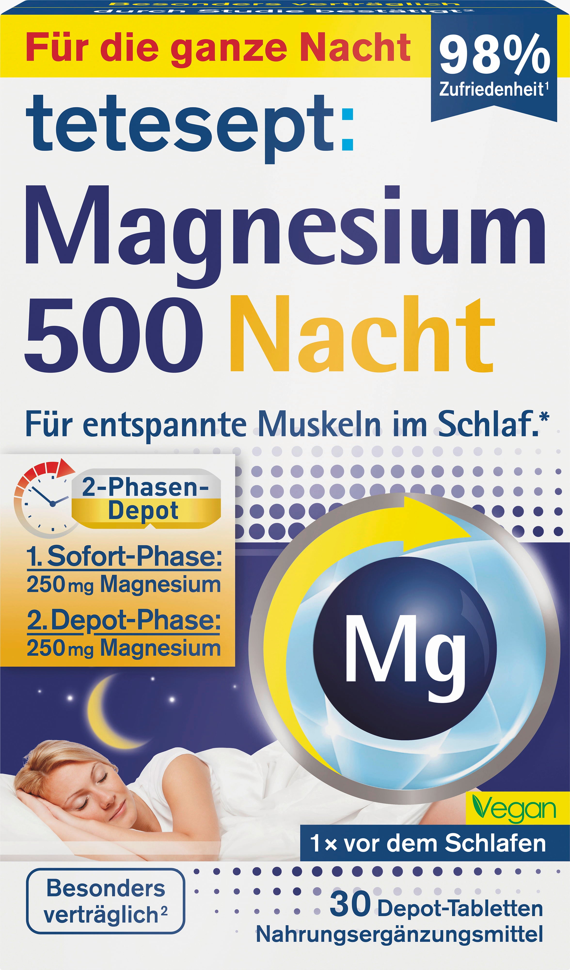 Los comprimidos Magnesio 500 Noche de tetesept presentan una fórmula bifásica que hace que una parte del magnesio esté inmediatamente disponible para el organismo. La parte restante se descompone uniformemente a lo largo de varias horas. Los comprimidos son ideales para tomar antes de acostarse. La fórmula es vegana y no contiene gluten ni lactosa.