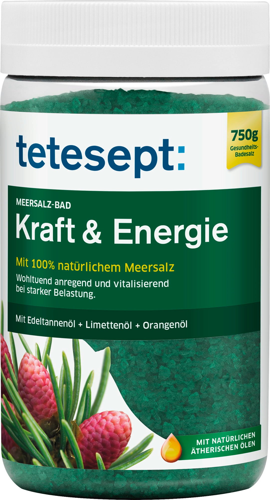 La Sal marina - Fuerza y energía de tetesept es el complemento ideal. Está compuesta al 100 % por sal marina pura y contiene aceites esenciales naturales de abeto blanco, lima y naranja: ¡una fragancia maravillosa de la que no podrás prescindir!