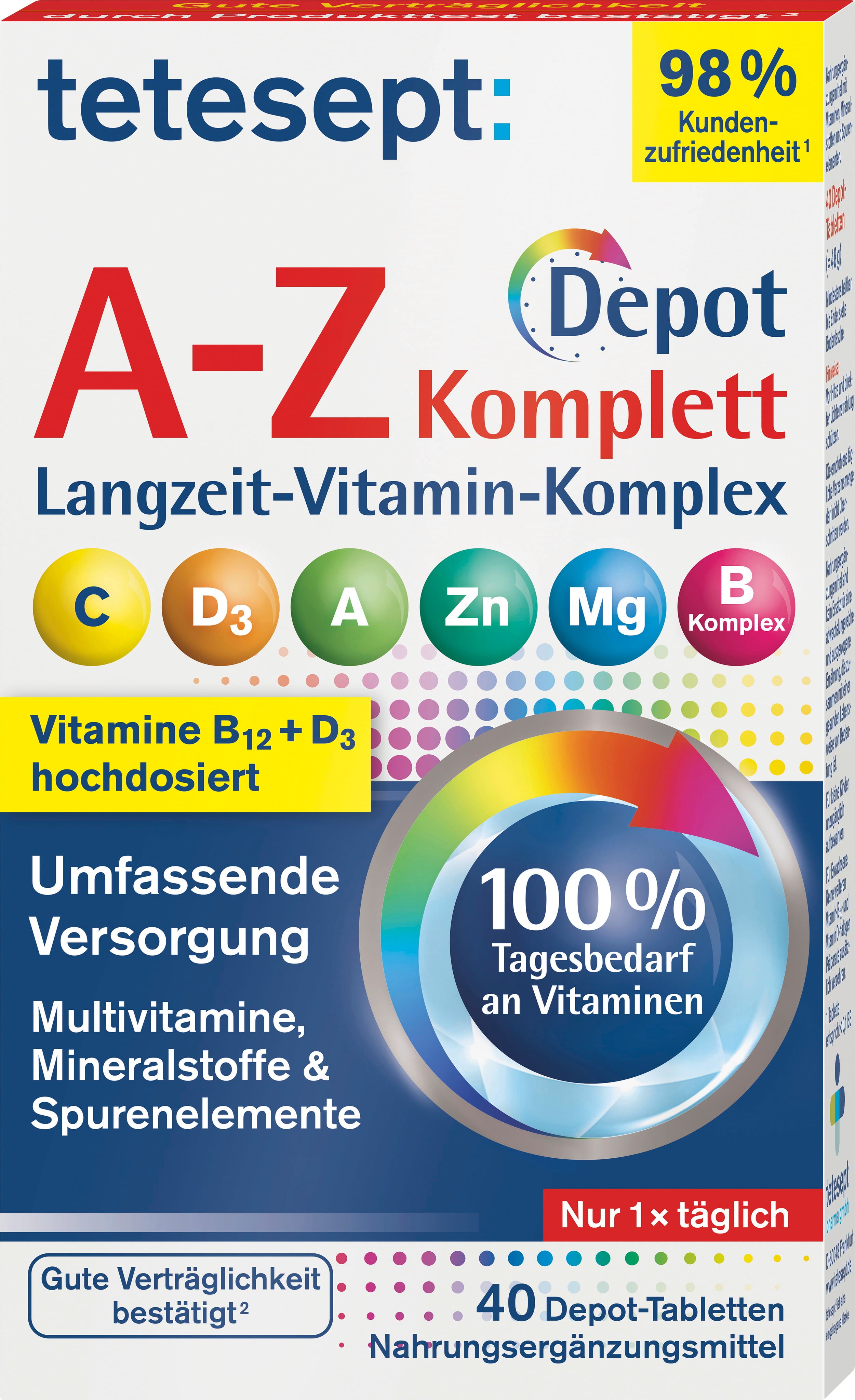 Los comprimidos de vitaminas A-Z de tetesept contienen una variedad de vitaminas, minerales y oligoelementos. Aportan al organismo, por ejemplo, vitaminas A, C, B12, D3, zinc, magnesio, selenio y yodo. Los comprimidos no contienen gluten ni lactosa.