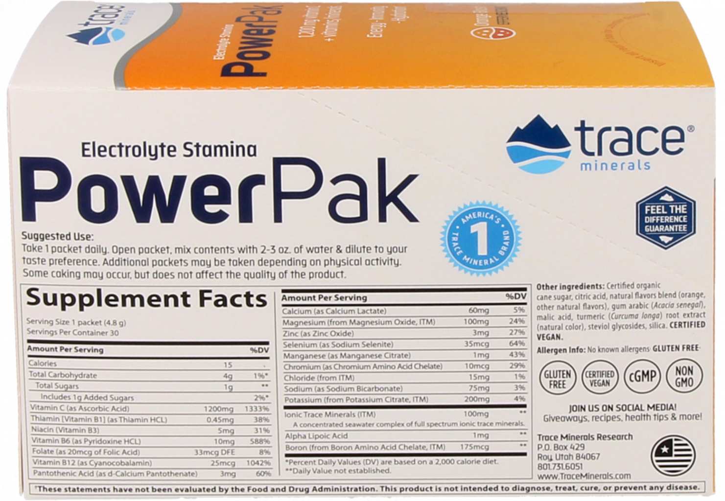 Power Pak de Trace Minerals Research es la bebida de resistencia perfecta. Cada bolsa contiene 1,200 mg de vitamina C y el conocido concentrado de oligoelementos, Concentrace®, con 72 electrolitos diferentes.