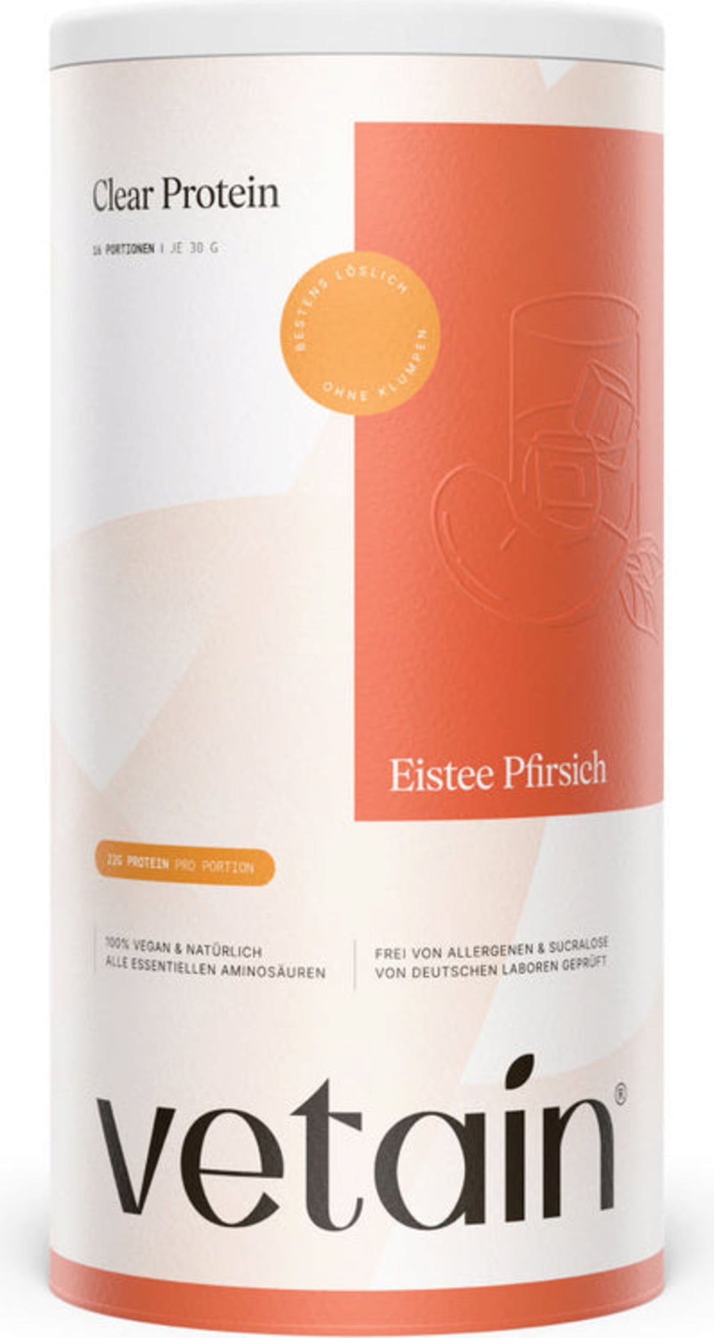 proteína de guisante, Inulin aus Zichorien, aromas naturales, ácido cítrico, melocotón en polvo, L-metionina, L-histidina, L-triptófano, cúrcuma (Curcuma longa), Edulcorantes (glucósido de esteviol)