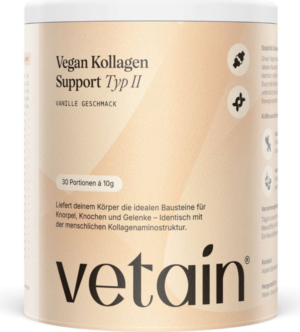 Vegan Collagen Support Type II de Vetain se basa en la materia prima patentada VeCollal® Type II. Contiene extractos de cúrcuma y saúco, así como vitamina C, zinc y biotina, todos ellos de origen vegetal y libres de componentes animales. Ideal para cualquier persona que desee incorporar a su dieta una alternativa vegetal al colágeno.
