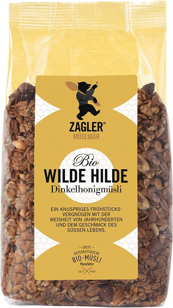 En ZAGLER MÜSLIBÄR decidieron llamar a este muesli "Hilde-Dinkel" para subrayar el hecho de que Hildegard von Bingen, la famosa santa alemana que vivió en la época medieval, también era una gran defensora de la ortografía. Hildegard era una monja y curandera, cuya medicina provenía del mundo vegetal y que descubrió el vínculo entre la salud del intestino y nuestro estado de ánimo. Por eso la espelta es el ingrediente principal de esta crujiente mezcla a la que se le han añadido pipas de girasol, almendras y nueces para un sabor simplemente perfecto. Para un desayuno bueno y saludable.